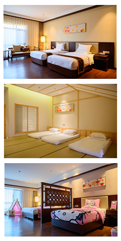 酒店總建筑面積30000多平方米,主樓高6層,設(shè)有150余間標(biāo)準(zhǔn)客房、家庭客房、日式客房和別墅客房。房內(nèi)設(shè)計新穎別致,充分考慮家庭度假需求,最小房型面積在50平米以上。